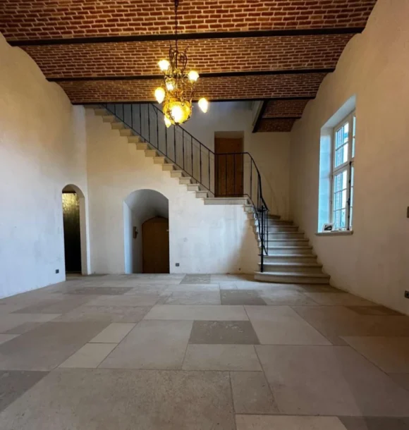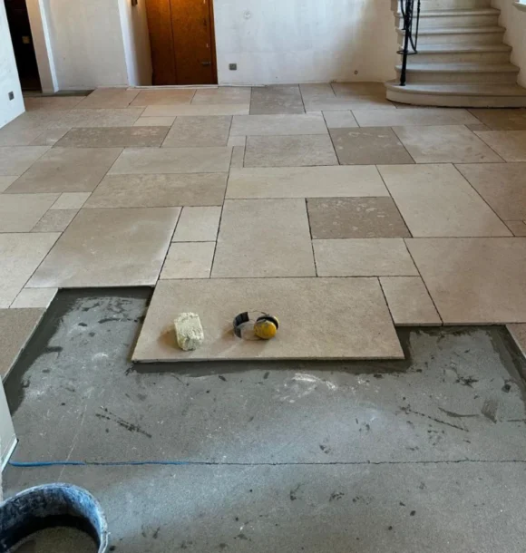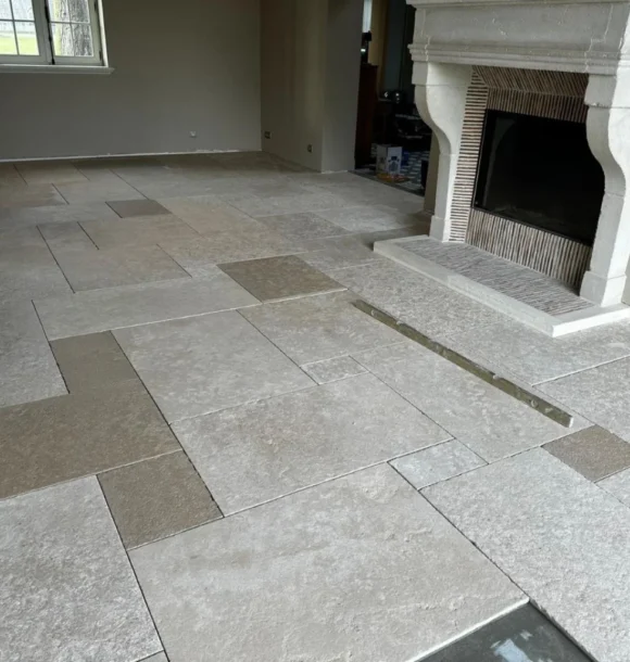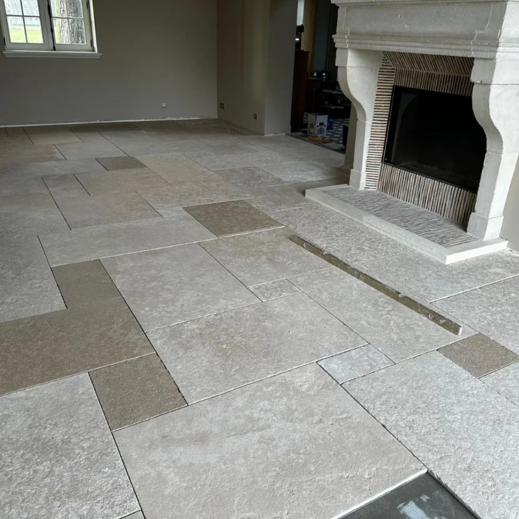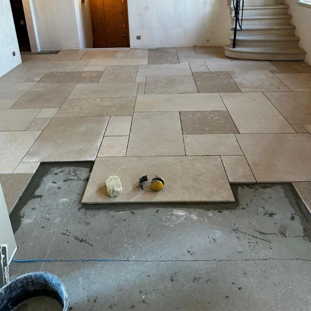 In dit project is gekozen om het natuursteen in wildverband te plaatsen. Deze traditionele legwijze versterkt het ambachtelijke karakter van de vloer en zorgt voor een levendig maar gebalanceerd geheel, passend bij een hoogwaardige woonomgeving.